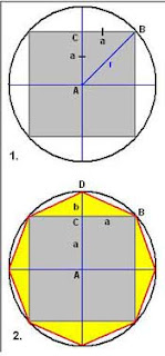 Şekil’de yarıçapı r olan bir dairenin içine bir kare oturtulmuş. Bu kareyi, daireye bir yaklaştırma olarak düşünüyoruz. ABC üçgeni ikizkenar olduğundan, karenin yarım kenar uzunluğu a=r/2′dir. Bu durumda karenin çevresi L=8a=42r, alanı A=(2a)²=(2r)²=2r² olur. Karenin çevresini, dairenin çemberine eşitlersek, L=2r eşitliğinden, 42r=2r veya =22 elde ederiz. Bu yaklaştırma bize, =2,828427 verir. Halbuki, karenin alanını dairenin alanına eşitlediğimizde, A= r² eşitliğinden, 2r²= r², yani =2 elde ederiz. Bu yaklaştırma, çemberin çevreye eşitlenmesiyle elde edilenden daha kötü. Şimdi yaklaştırmamızı bir adım daha ileri götürmek üzere, bu sefer dairenin içine, bir kare yerine, eşkenarlı bir sekizgen oturtalım. Alttaki 2 numaralı şekilde bu durum görülüyor. Eşkenarlı sekizgenin kareye göre fazlalık alanları sarı renkle tonlandırılmış. AD uzunluğu r’ye eşit ve a=r/2 olduğuna göre; BCD üçgeninin yüksekliğinin b=r-r/2 olması gerekir. BC kenarının uzunluğu a=r/2 olduğuna göre, BD kenarının uzunluğunun karesi a²+b² = r²/2+ (r²+ r²/2- 2r²/2)=2r²-2r²=(2-2)r² olur. O halde BD’nin uzunluğu |BD|=(2-2)½ r’dir. Sekizgenin çevresi bunun 8 katı, yani L=8.(2-2)½ r’ye eşittir. Bunu dairenin çevresine eşitlersek, L= L=2r eşitliğinden, 8.(2-2)½ r = 2r veya =4.(2-2)½ elde ederiz. Bu yaklaştırma bize, =3,06146 verir. Bir önceki yaklaştırmadan daha iyi. Öte yandan, BCD üçgeninin alanı a.b/2= (r/2).(r-r/2)/2=r²/22- r²/4 olur. Sekizgenin alanını elde etmek için, karenin alanına bu üçgenlerden sekizinin alanını eklemek gerekir: A=(2a)²+8.(r²/22- r²/4)= 2r²+22r²- 2r²=22r². Bu alanı dairenin alanına eşitlersek, A= r² eşitliğinden, 22r²= r², yani =22=2,828427 elde ederiz. Görüldüğü gibi, bu yaklaştırma, çemberin çevreye eşitlenmesiyle elde edilenden daha kötü, ama kare ile elde edilen yaklaştırmalardan daha iyi bir sonuç. Demek ki, herhangi bir eşkenar çokgenle yaklaştırmada, çevrelerin eşitlenmesi, alanların eşitlenmesinden daha iyi sonuç veriyor gibi. Böyle bir genelleme yapmak mümkün. Bunun nedeni, çokgenlerin çevresinin dairenin çevresine, çokgenlerin alanlarının dairenin alanına yaklaştığından daha hızlı yaklaşıyor olması. Asıl ilginç olanı, sekizgenle yaklaştırmada alanların eşitlenmesiyle elde edilen sonuç, kare ile yaklaştırmada çevrelerin eşitlenmesiyle elde edilen sonucun aynısı. Bunun nedenini de siz düşünüp bulun.